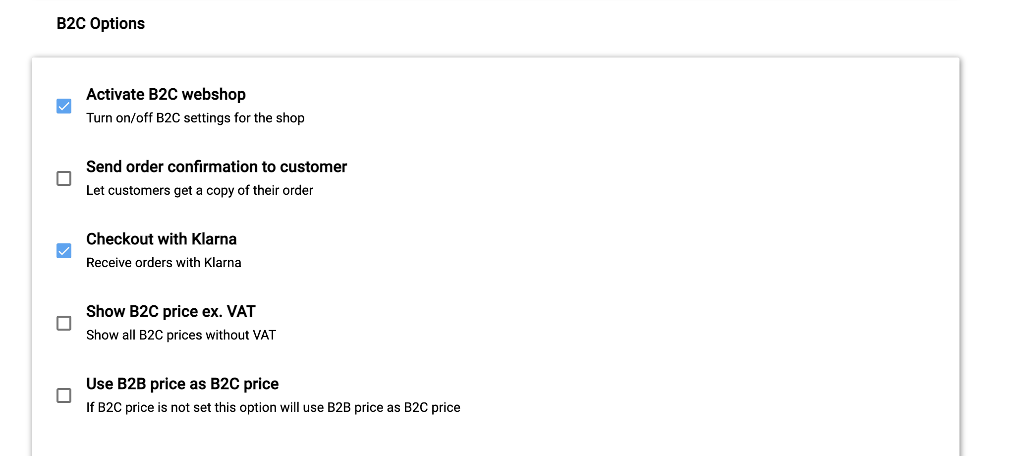 2. Scroll down to “B2C Options”. Check off “Activate B2C webshop” then “Checkout with Klarna”.