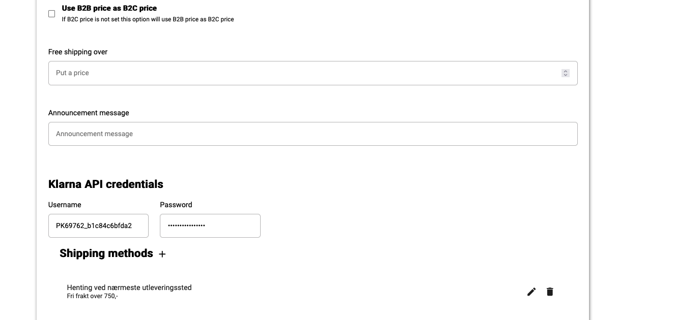 3. Now you will be able to connect to Klarna. Scroll down to “Klarna API credentials” and fill in your username and password from Klarna. After you have filled out username and password click save.