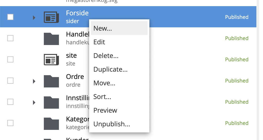 3. Right click on “Forside” (or “Products” if you don’t have a front page) and click “New…”