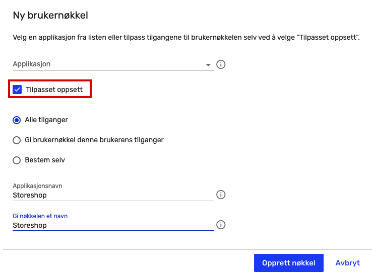 2. To create a Tripletex-key for Storeshop, click “Custom setup/Tilpasset oppsett”.